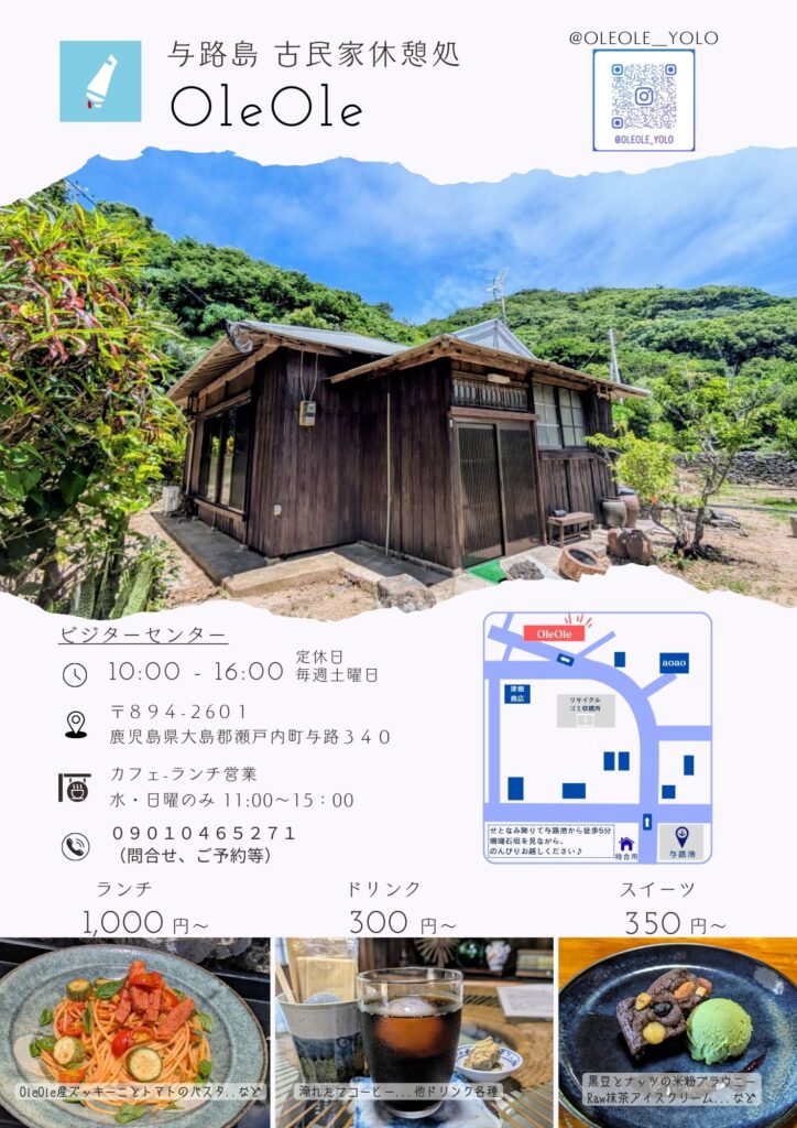 与路島の宿泊施設・飲食店 与路島の宿泊施設・飲食店について 宿泊施設 飲食店 カフェ OleOle □所在地/瀬戸内町与路340□営業時間:毎週水曜・日曜 11:00~15:00日替わりランチ1,000円~、スウィーツ400円~、ドリンク300円~詳しくは⇒