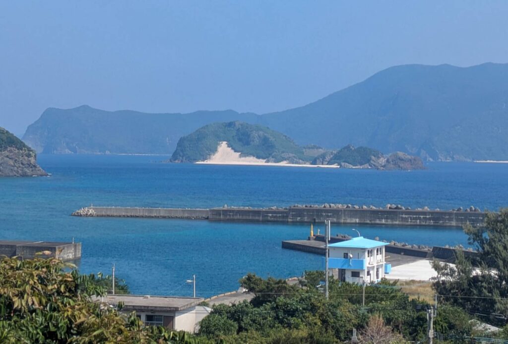 アデツ浜からは真っ白な浜辺の砂が山の方まで吹き上がって、砂丘の様にみえるハミヤ島や与路島に物資や人を運ぶ船が行き来する光景がみえるビーチです。また、潮がひくと地元のおばあちゃん達がサヤガタイモ貝を拾いに浅瀬を集団で歩くのも与路島ならでわの特色です。