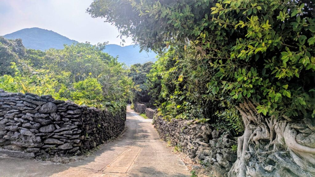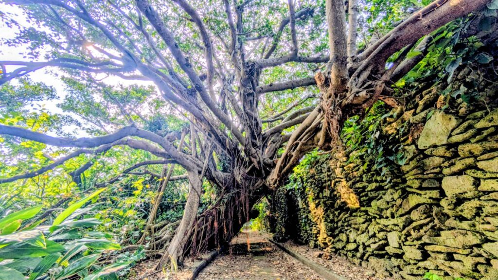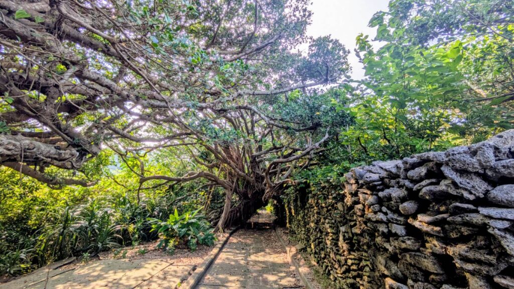 道路側のガジュマルの木が成長し過ぎて隣の民家に侵食してできたガジュマルのトンネル。人気の与路島のサンゴ石垣と大きなガジュマルの木で出来たトンネルは絶好の撮影ポイントでもありながら、暑い日差しの日に日陰で少し休憩の出来る場所でもあります。