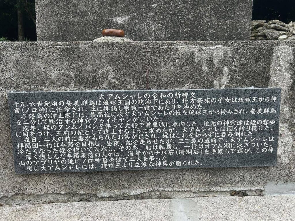 15~16世紀の琉球王朝が奄美を支配していた頃、ノロ神が奄美を治めていた。奄美群島を二分して支配するノロ神の最高位に次ぐ位の神官の大アムシャレの碑